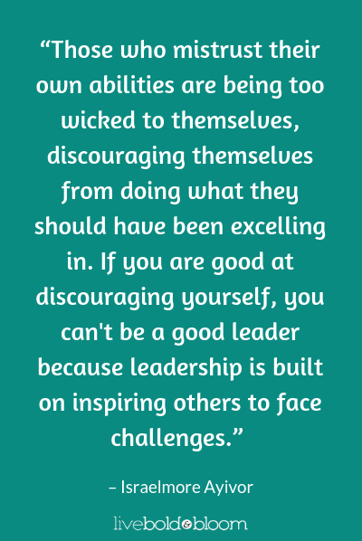 28.“Those who mistrust their own abilities are being too wicked to themselves, discouraging themselves from doing what they should have been excelling in. If you are good at discouraging yourself, you can’t be a good leader because leadership is built on inspiring others to face challenges.” ― Israelmore Ayivor
